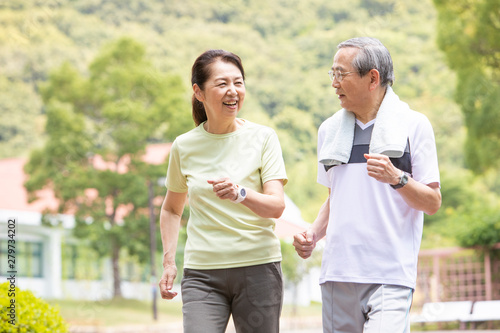people, lifestyle, sport, two people, japanese, asian, adult, man, woman, family, couple, couple, 60's, aged, smile, conversation, speaking, run, jog, marathon, running, exercise, health, park, open air, verdure, green, healthy, aged, second life, active, lively, walking, walk, towel, walk, happy, fun, joyful, rehabilitation