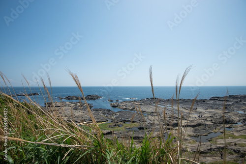 miscanthus sinensis, sea, beach, horizon, blue skies, blue, landscape, nature, hike, sunny, rock, sky, tour tourism, tourist attraction, kanagawa, outdoors, copy space, green, japan, pretty, clean, showplace, travel, view, leaf, pacific ocean, mountain, light, lovely, green, summer, trek, leisure