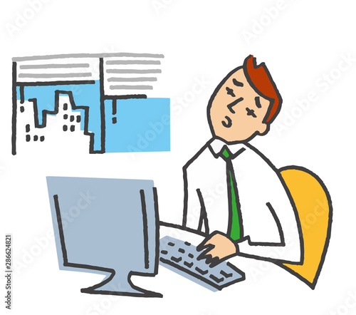 people, employee, office, corporation, marode, illustration, cut, illustration, salaried employee, man, man, young, window, work, drowsy, sluggish, apathy, stress, personal computer, waist up, health, hangover, material, business, businessman, overtime, overwork