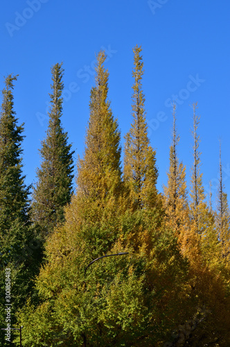 青空を背景にして、黄葉し始めたイチョウの樹の並木の梢をローアングルで撮影した写真