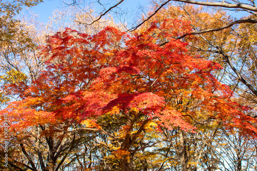 nature, fall, wood, red, leaf, fall, sky, forest, yellow, season, acer, blue, park, pigmentation, foliage, branch, orange, landscape, lovely, colourful, yoyogi park, morning