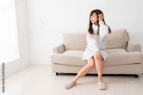 woman, young, home, beauty, lovely, happy, white, portrait, person, morning, health, smile, relax, face, japanese, copy space, vacation, lifestyle, living room, couch, room