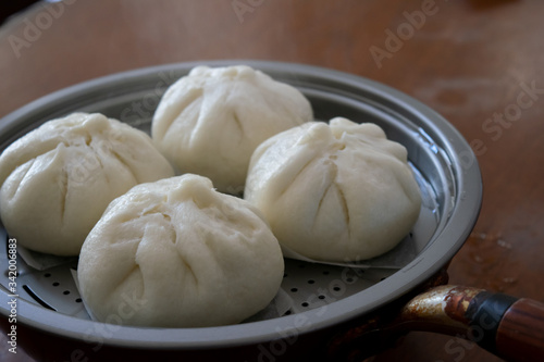 自宅で手作りする肉まん 蒸したての湯気があがる肉まん