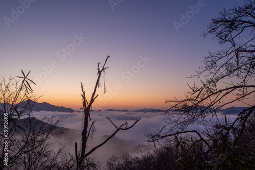 fog, silhouette, morning, cloud, sunrise, wood, sun, sky, lovely, landscape, nature, forest, orange, japan