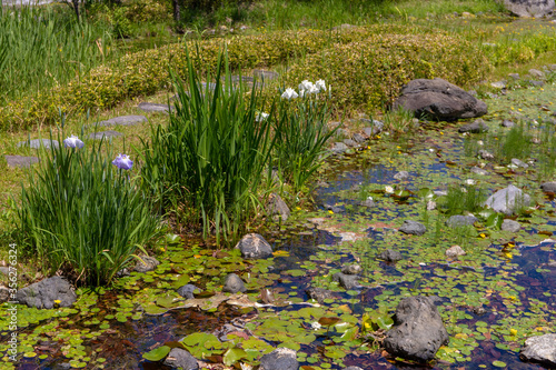 mere, japanese garden, iris, sacred lotus, garden, water, nature, garden, landscape, mere, green, park, grass, flower, summer, lovely, plant, season, flow, plant, purple, white