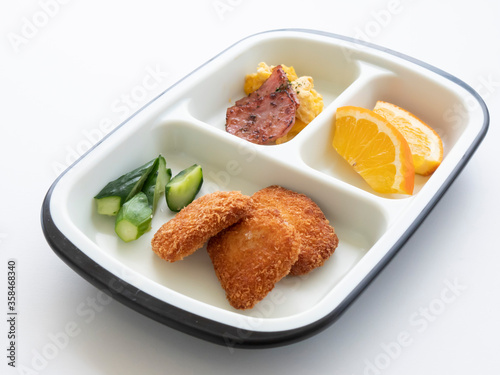 meal, dish, aged, handcraft, aged, bento, health, nursing home, dinner, nursing home, lunch, dementia, alimentation, delicious, cucumber, orange, bacon, egg, fries