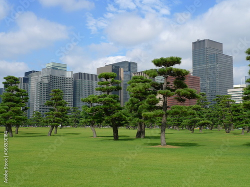 皇居外苑の松林の向こうに見える丸の内のビル群