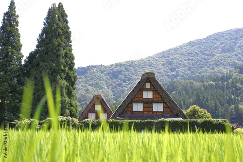 house, architecture, building, nature, wood, green, roof, grass, triangle, aged, tradition, history, straw, window, rice field, paddy, sky, blue, white, cloud, mountain, world heritage, tour tourism, travel, celebrate, summer, human settlement, countryside, landscape, view, japan, culture
