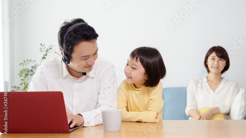 telecommuting, family, family, business, businessman, salaried employee, employee, work, work, personal computer, notebook, smile, speaking, children, children, children, child rearing, people, japanese, asian, girl, daughter, woman, man, house, wife, husband, father, father, father, father, mother, mother, indoor, conversation, home, videoconferencing