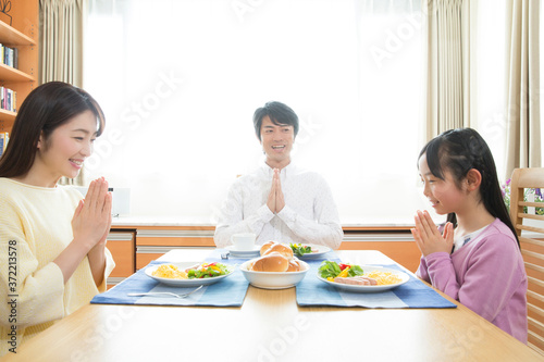people, family, mother, father, children, daughter, girl, japanese, meal, breakfast, dish, table, greeting, person, family, mother, mother, father, father, father, children, children, woman, meal, breakfast, table, dining table