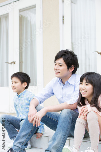 people, family, father, children, son, daughter, boy, girl, japanese, garden, seated, person, family, father, father, father, children, children, boy, woman, father and son