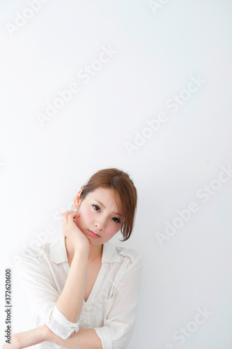 woman, cosmetic, young, shirt, person, lovely, student, happy, smiling, portrait, beauty, indoor, blank, hair care, clean, refreshing, pretty, hair, white, brown-haired, coiffure, thought, contemplate