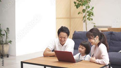 person, people, portrait, children, girl, woman, man, family, family, japanese, japan, asian, personal computer, laptop, notebook, motion picture, videophone, online, grandfather, grandparent, grandmother, corona, cyberspace, vacation, holiday, chum, 30s, house, move, couch, window, drape, table