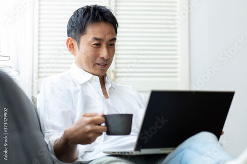 lifestyle, asian, japanese, man, notebook, coffee break, indoor, indoor, house, home, live, man, people, adult, 30s, middle-aged, waist up, look, mobile, computer, personal computer, personal computer, casual, vacation, off, relax, possess, drink, drink, coffee, coffee cup, cup, break
