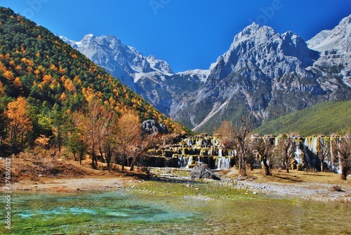 october, fall, november, landscape, mere, stream, waterfall, water, lake, stroll, hike, travel, tour tourism, showplace, tour, sunny, blue skies, lookout, china, yunnan, lijiang, nature, landscape, view, world heritage, glacier, mountain