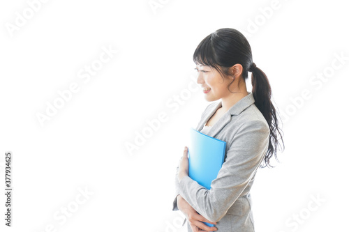 suit, work, smock, style, dress, jacket, cleaning, career woman, casual, shirt, smile, smile, smile, smile, ponytail, coiffure, temp, pay, bonus, bonus, stress, greeting, boss, secondary, secretary, reception, woman, asian, japanese, chinese, korean, white background, copy space
