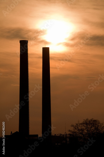 factory, chimney, sunset, backlighting, sun, sunset, silhouette, asia, orient, japan, kyoto, kyoto, evening, light, sky