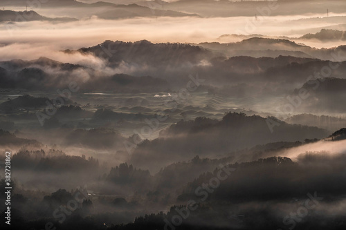 mountain, fall, sunset, sky, landscape, sunrise, cloud, nature, sun, morning, blue, fog, morning, light, sunlight, tonight, blur, hill, evening, pigmentation, orange, summer, forest