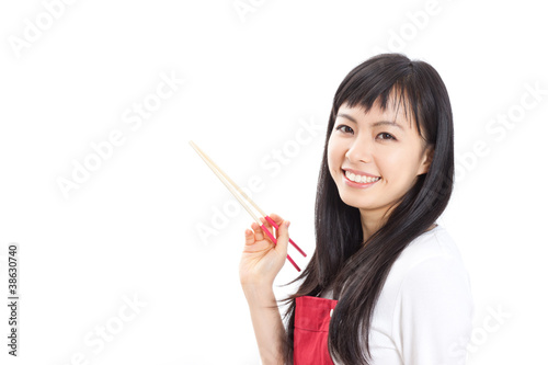 woman, girl, dish, chopstick, apron, red, smile, sweet, beauty, japanese, asian, people, young, fun, preparation, meal, japan, asia, copy space, portrait