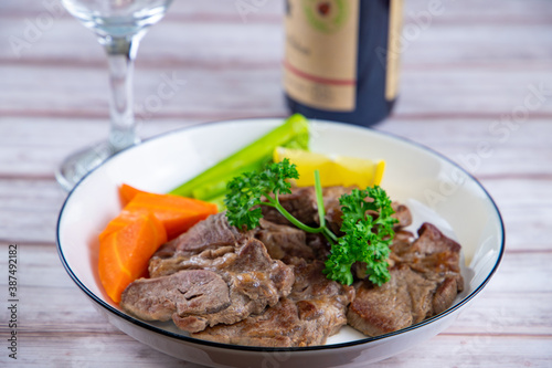 beefsteak, steak, beef, dish, meal, dinner, dinner, meat, meat dish, table, meal, parsley, lemon, food, food, meal, wine, wine glass, red wine, asparagus, carrot, carrot, carrot, table, grain, dish