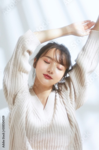 smile, people, portrait, 30s, model, woman, young, missy, japanese, korean, asian, indoor, light, cosmetic, beauty, beauty, skincare, make-up, make-up, make-up, cosmetic, este, skin, facial, fashion, sweater, knit, stretching, beauty, beauty, sweet, relax, face, expression, shadow, light