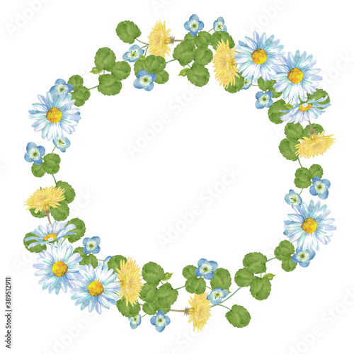 spring, illustration, watercolor, handwriting, natural, nature, background, picture, green, green, decoration, plant, leaf, wildflower, weed, flower, flower, flower, blue, early spring, decoration, ornament, pretty, lovely, sweet, green, material, full bloom, art, wildflower, picture, taraxacum, yellow, bouquet, frame, frame, leasing, margaret, daisy, white