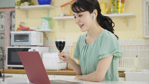 オンライン飲み会をする若い女性