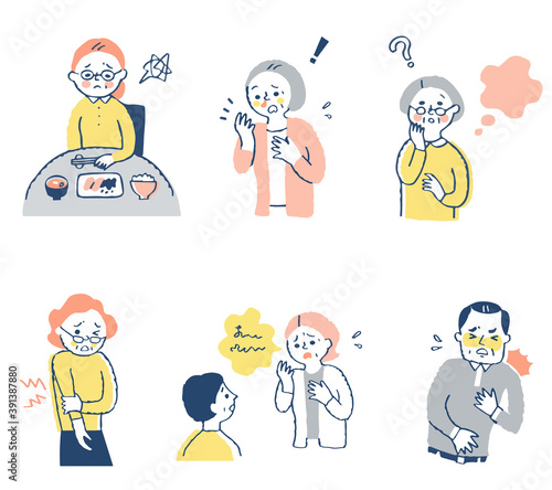 people, illustration, japanese, marode, symptom, set, variation, aged, aged, plural, woman, man, ageing, medical care, health care, painful, anorexia, heart attack, cardiopathy, articulation, fatigue, aged, dementia, attack, 50's, 60's, cold, meal, torment, pain
