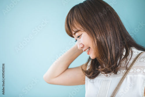 date, profile, woman, fashion, bag, model, smile, pose, sky blue, pop, long hair, straight hair, straight, curl, perm, sweet, girl, colourful, beauty, indoor, waist up, cosmetic, coiffure, coiffure, portrait, hair care, young, people, sarong, japanese, hair salon, 30s, travel, copy space, brown-haired