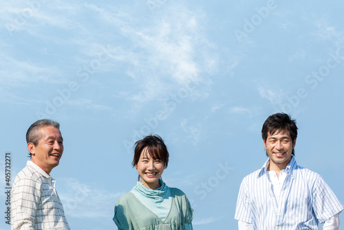 lifestyle, people, japanese, japan, asian, adult, 30s, young, man, woman, family, family, couple, couple, lover, waist up, front, father, daughter, son, aged, aged, grandfather, grandfather, smile, smile, chum, light, fun, joyful, blue skies, sky, open air, open air, happiness, portrait
