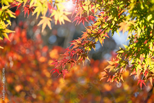太陽の光を浴びる紅葉した葉
