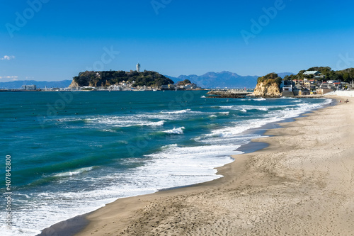 神奈川県鎌倉市 晴れ渡る七里ヶ浜と江ノ島