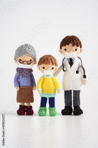 family, aged, elderly, woman, grandparent, children, toddler, stethoscope, mask, infection, flu, hay fever, exam, hospital, doctor, doctor, labcoat, doll, soft toy, toy, sweet, soft, medical care