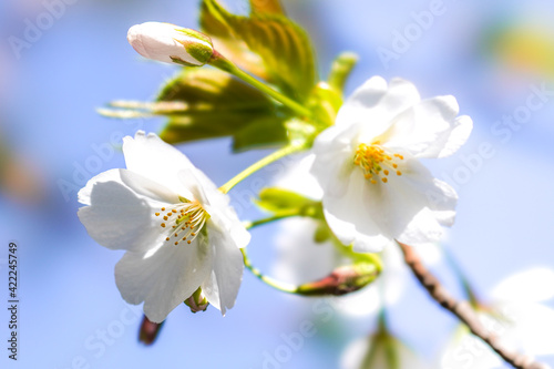 flower, sakura, cherry blossom, sakura, light, copy space, april, bloom, pale, nature, wood, blue skies, white, flower petals, plant, sunny, spring, up, closeup, leaf, green