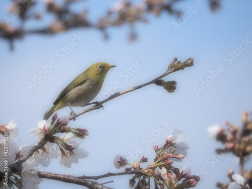 桜の枝に止まるメジロ