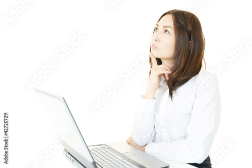 contemplate, embarrassment, personal computer, notebook, keyboard, communication, health, cosmetic, woman, beauty, model, sweet, pretty, young, people, lovely, japanese, black hair, office, business, ol, career woman, light, woman, girl, happy, happiness, healthful, clean, beauty, expression, dispatch, white background, copy space, pose, work, corporation, corporate, staff, office worker, employee