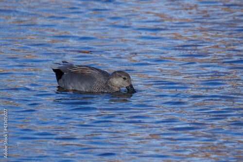 青空とメタセコイアの黄葉映す水面をのんびり泳ぐオカヨシガモ メス