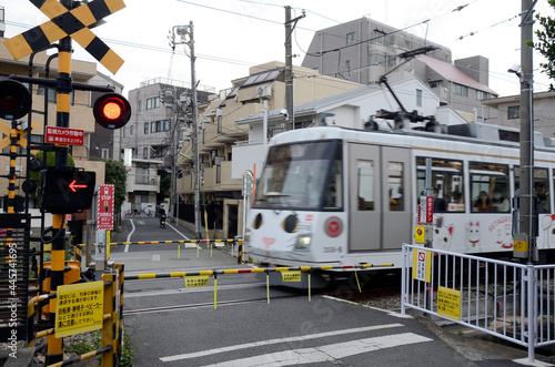 crossing, train, train, rail, transportation, speed, city, red, building, building, condo, ramp, arrow, speed, daytime, landscape, japan, rail, sky, window, tram, door, door, rail, vehicle, route