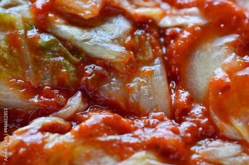 kimchi, pickle, food, foodstuff, orange, hot pepper, bok choy, spicey, vegetable, side dish, pot, white, green, up, red, dinner, meal, dish, delicious, epicure