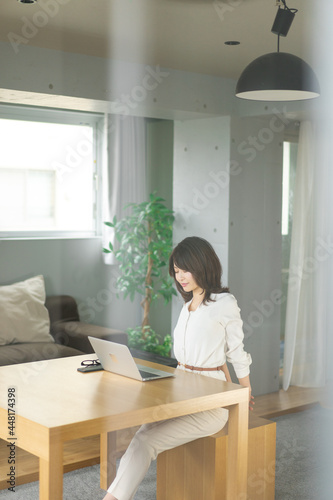 telecommuting, fatigue, stress, break, stretching, refresh, breather, growth, home, room, home office, business, freelance, web, personal computer, personal computer, screen, attitude, improve, stretch, breath, working, concentration, young, woman, asian, japanese, chinese, korean, house, copy space, notebook, computer
