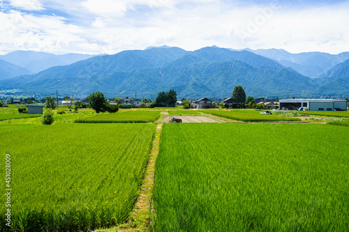 tractor, agricultural machinery, idyl, mountain, blue skies, cloud, rice, crop, crop, range, summer, cultivation, grow, farming, wood, rice field, refreshing, nature, landscape, rural, forest, copy space, view, vivid, journey, warehouse, truck, green, japan, photo