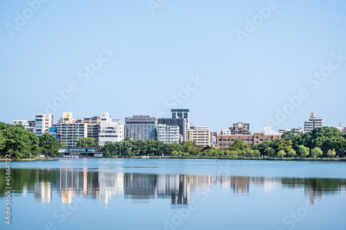landscape, fukuoka, travel, mere, tour tourism, symbol, copy space, boat, showplace, bridge, destination, visitor, fukuoka, celebrate, park, building, city, sky, water, lake, journey, water surface, architecture, reflex, summer, sunny, open air, blue skies