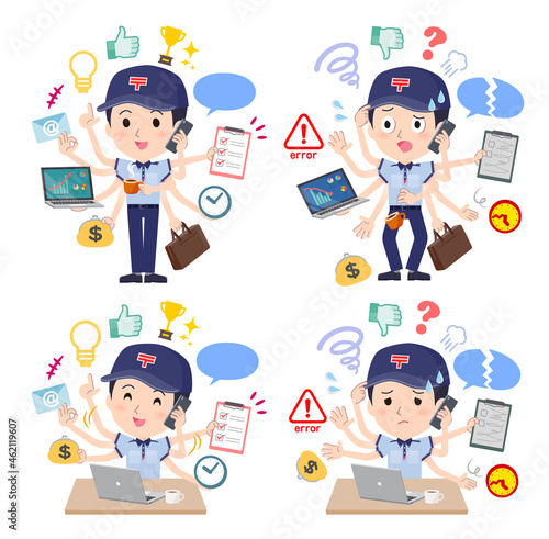 pressed for time, multitask, mail, post office, delivery, staff, uniform, occupation, man, japanese, people, labor, efficiency, busy, able, success, workaholic, flop, check, bag, break, chart, like, ok, idea, office, money, time, smartphone, notebook, mail, character, sweet, set, pose, affinity, vector, illustration