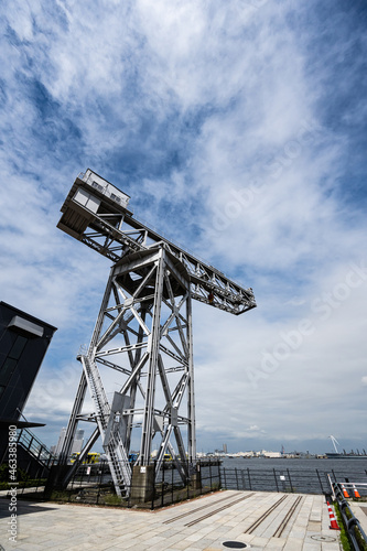 asia, japan, kanagawa, yokohama, city, daytime, landscape, landscape, view, open air, nature, travel, tour tourism, tourist attraction, copy space, blue, sky, blue skies, sunny, sea, beach, wave, pacific ocean, port, crane, hammerhead, building, construction, building, quay