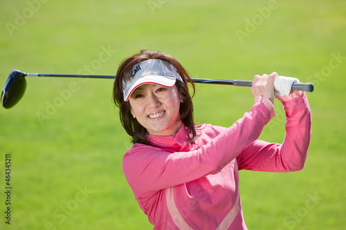 ティーショットをするゴルフを楽しむ中高年女性アップ