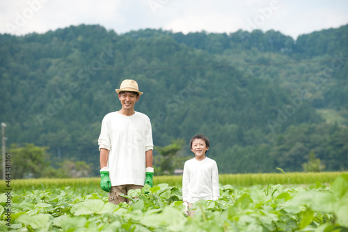 japanese, august, lifestyle, open air, family, 30s, industry, children, smile, people, man, son, adult, boy, man, two people, farming, field, father, stand, 2012