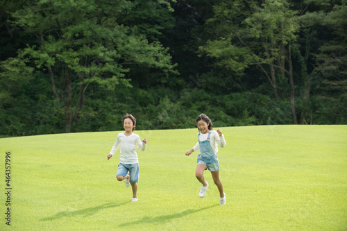 japanese, september, brother, lifestyle, leisure, open air, fun, park, children, grass, girl, people, man, run, adult, boy, two people, friends