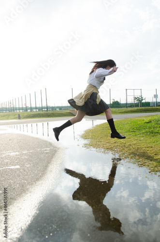 japanese, october, playground, open air, student, lively, afternoon, youth, girl, people, man, puddle, water surface, uniform, jump, fly, schoolgirl