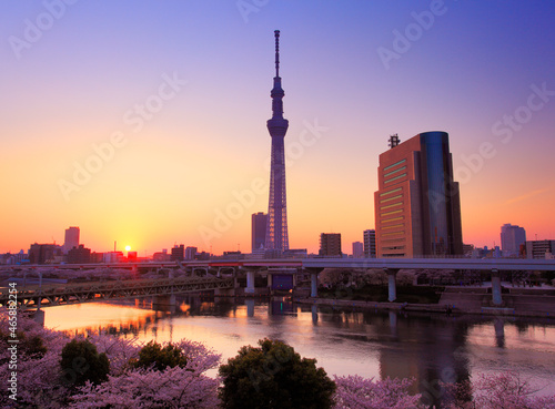 隅田公園の桜の林と東京スカイツリーと隅田川と朝日, 台東区,東京都