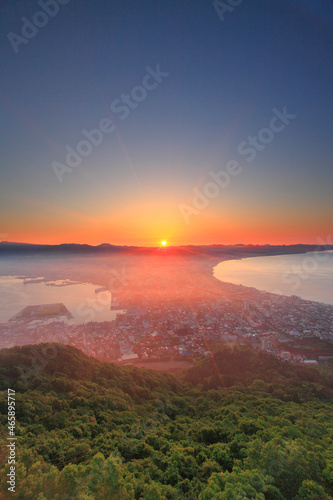 函館山から望む函館市街と昇る朝日, 日本,北海道,函館市